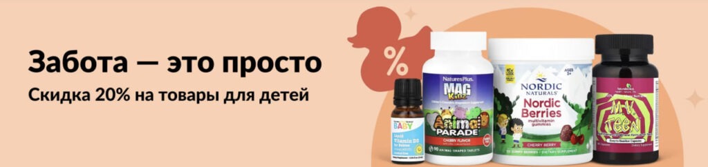 💡 Промокоды могут действовать на весь заказ или на отдельные категории – витамины, добавки, косметику, продукты питания, спортивное питание.